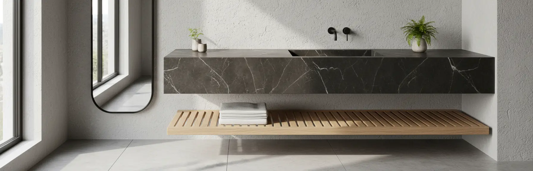 פורצלן (Porcelain): חומר אידיאלי בזכות אפס ספיגה ועמידות מוחלטת לחום וכתמים. מותגים כמו Ascale, Laminam ו-פלורים פורצלן מציעים לוחות המאפשרים יצירת כיור חזק במיוחד שאינו משנה את צבעו.